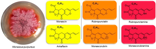 The genus Monascus sp. is well known for producing metabolites such as lovastatin and polysaccharides, as well as pigments such as monascin and ankaflain (yellow); rubropunctatin and monascorubrin (orange); and rubropunctamine and monascorubramine (purple-red) (Figure 1) [13]. The genus Monascus is described as aerobic, saprophytic, prototrophic, mesophilic (optimal temperature of 30–35 °C), and with respirofermentative metabolism. When the fungus is in a medium with an excess of glucose, Monascus sp. can form ethanol under aerobic conditions, and therefore can be classified as Cabtree negative with limited respiration [14].