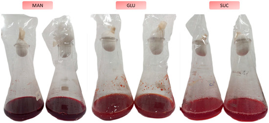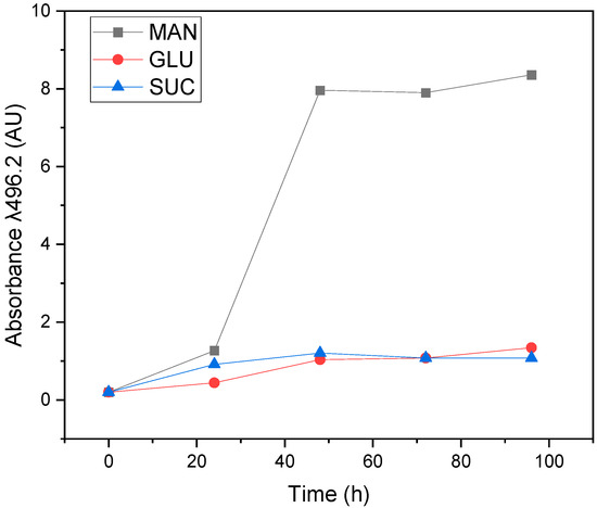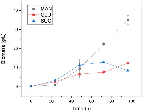 After 24 h, GLU and SUC treatments produced higher biomass concentrations (2.7 and 3.2 g/L, respectively) than the MAN treatment (1 g/L). Within 48 h of cultivation, the biomass production demonstrated no significant difference between the treatments (p = 0.4996) (Figure 3).