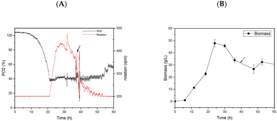 In the present work, the DO decreased in the first 20 h of cultivation without changing the agitation speed (200 rpm). After that, there was an increase in agitation to supply the oxygen demand required by the microorganisms, reaching 450 rpm at the 30th hour, indicating increased cellular activity. After 30 h of cultivation, the oxygen demand decreased, indicating the stationary growth phase of the microorganisms, observed by the decrease in the need for agitation (red line, Figure 8A). At this time, there was a pH change to 8.5, indicated by the arrow in Figure 8A.