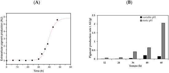 Finally, the calculation of the pigment production rate (Figure 9B) corroborated the previously discussed results: (i) there was no pigment production in the first 24 h for the variable pH treatment, while some pigment production occurred for the static pH treatment; (ii) the pigment production rate was much higher in the static pH treatment compared to the variable pH treatment.
