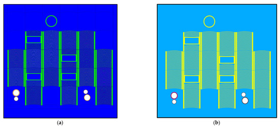 Full cross-sectional view of the OpenMC model: (a) XY-axis plan view with color code; (b) YZ-axis plan view, where the black borders represent the model geometric boundary.