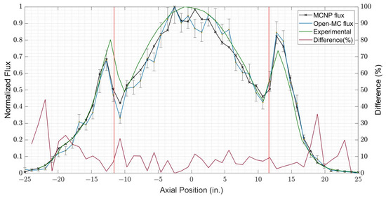 MSTR flux profile produced by the MCNP5 and OpenMC models. MCNP5 flux data were obtained from reference [12], where the difference (%) line indicates the error percentage between MCNP5 and OpenMC, while the vertical red line indicates the active fuel region.