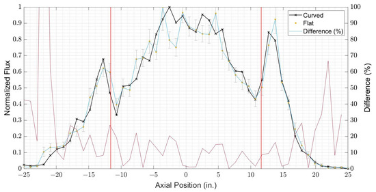 The axial flux for curved and flat core; difference (%) line indicates the error percentage between curved and flat values, while the vertical red line indicates the active fuel region.