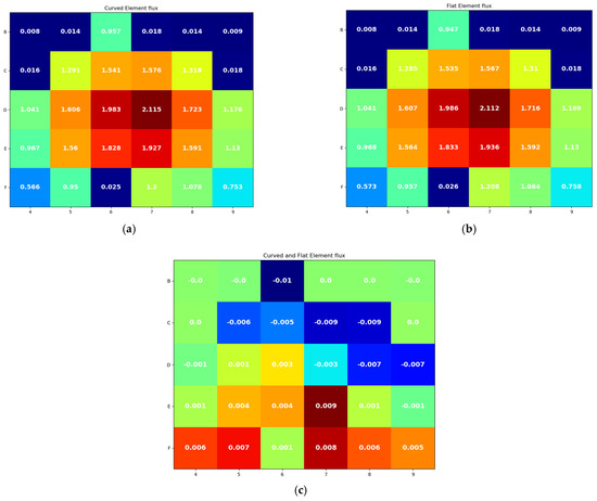 Radial flux of (a) curved fuel, (b) flat fuel, and (c) the difference between the fluxes.