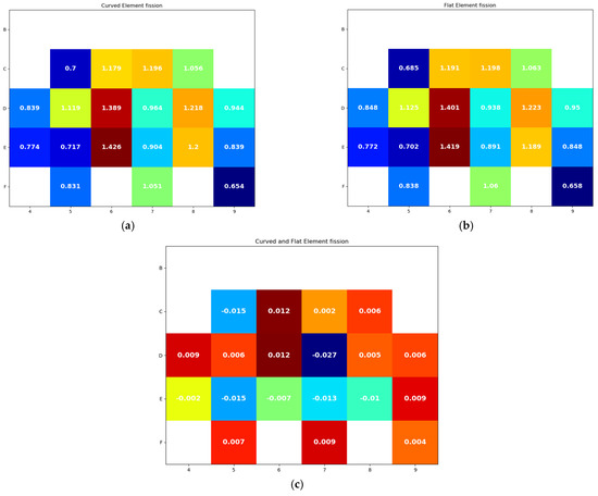 Radial fission distribution of (a) curved fuel, (b) flat fuel, and (c) the difference.
