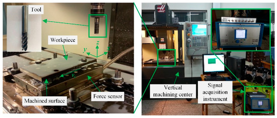 The machine used in the experiment was HAAS-VF1 vertical machining center (HAAS Inc., Oxnard, CA, USA). The experimental tool was Walther end mill H4020017-10-1 (Walter Inc., Tubingen, Germany). Its material was carbide, its diameter is 10 mm, the overall length is 65 mm, the number of teeth is 4, the elastic modulus is 210 GPa and the experimental clamping suspension length is 40 mm. The milling force sensor was a type 9257B three-way dynamic voltage power sensor (Kistler Inc., Shanghai, China). Shank adopts spring chuck shank. The photography of the milling experiment and force measuring equipment are shown in Figure 1 [28].