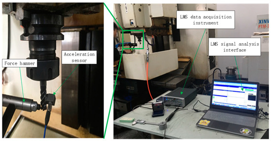 The LMS dynamic performance test system was used to obtain system modal parameters. The system is composed of force hammer, acceleration sensor, corresponding data acquisition equipment and signal analysis software LMS Test.Lab8b (LMS Inc., Leuven, Belgium). The experimental equipment is shown in Figure 2. Table 3 shows the tool modal parameters.