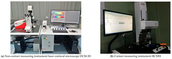 In order to reduce the influence of high-frequency errors on the results, the surface topography was characterized by three-dimensional surface roughness parameter values and two-dimensional surface roughness parameter values. Noise removal for area (3D) data should be considered when profile (2D) features are applied [29,30]. The non-contact measuring instrument laser confocal microscope DCM-3D (Leica Inc., Weztlar, Germany) was used to measure three-dimensional surface roughness, and the contact measuring instrument RC50H (VALE, Xi’an, Shaanxi, China) was used to measure two-dimensional surface roughness, as shown in Figure 3. Ra is the two-dimensional surface roughness parameter value; Sa is the three-dimensional surface roughness parameter value.