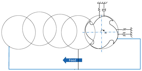 For the milling process, the diagram of milling surface topography is shown in Figure 4. After determining the cutting parameters and tool geometric parameters, the machined surface topography under ideal machining conditions can be obtained. The boundary point of the machined surface contour was determined by calculating the intersection point of two adjacent tool tooth profiles, and the cutting surface of the workpiece was obtained by connecting two tool points. The profile of the tool relative to the workpiece is determined by the actual cutting path of the tool in the process of machining. The actual cutting path of the tool is not only related to the cutting parameters, but also to the dynamic characteristics of the process system during machining [31]. As shown in Figure 5, the chatter of the process system leads to the relative vibration displacement of tool and workpiece and the dynamic parameters of the milling system change with the change in machining position and cutting depth. The formation process of surface topography is affected by the dynamic characteristics of the milling system, so that the ideal tool path is disturbed. Due to the relative vibration between the tool and the workpiece, the subsequent teeth will cut the higher residual surface out of the cutting front teeth. Therefore, in the milling process, it is necessary to consider the influence of the dynamic characteristics of the tool-workpiece system in the machining process and establish the milling surface topography model from the physical angle.