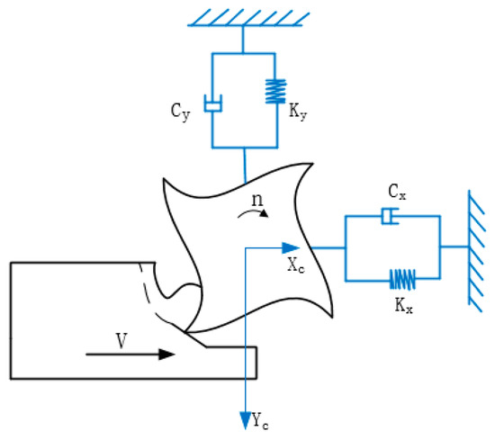 The dynamic model of milling ultra-high strength steel with a carbide tool is the theoretical basis for analyzing the dynamic displacement of tool and workpiece. According to the characteristics of rigid and flexible combination between tool and workpiece, the hard alloy tool milling ultra-high strength steel is assumed to be a flexible tool–rigidity workpiece dynamic milling system. The dynamic milling process dynamic model is shown in Figure 10. The system is simplified as a flexible double degree of freedom system perpendicular to the x and y directions.