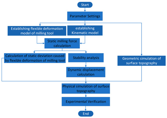 According to the above literature, the current research on milling surface roughness mostly adopts experimental and simulation methods. The regression model is established through a large number of experimental data. The simulation method is mainly to explore the machining mechanism, simulate the geometric and physical factors in the cutting process and establish the mathematical model of the position of the tool relative to the workpiece according to the factors that affect the formation of the surface topography. Compared with the experimental method, the simulation method is more cost-effective and can reveal the formation mechanism of surface topography. For the study of the analytical model of roughness, the geometric factors and kinematic parameters in the milling process are considered to establish the simulation model. In the milling process, due to the flexible deformation of the milling cutter and the dynamic displacement of the milling system, the cutting tool deviates from the ideal cutting trajectory, which affects the milling surface topography. The current simulation model of milling surface roughness has not fully considered the flexible deformation of milling cutter and the dynamic displacement of the milling system. In order to better predict the surface topography of the milling system, a surface topography model based on the dynamic characteristics of the milling system was established by combining the flexible deformation model of milling cutter and the dynamic model of the milling system.