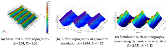 The measured and simulation results of the milling surface topography of ultra-high strength steel are shown in Figure 12. The change trend of measured and simulated surface topography is consistent, the shape is close and the simulated and measured surface roughness parameters are close, the simulated values of Sa have an average error of 10.9%. The results show that the milling system simulation results based on the dynamic characteristics of ultra-high strength steel can get close to the measured surface topography. The difference between the geometric simulation and the measured surface section profile Ra is 0.16 μm and the difference between the simulation considering dynamic characteristics and the measured surface section profile Ra is 0.07 μm, indicating that the simulation considering dynamic characteristics is closer to the measured value than the geometric simulation. Because the material in the axial plastic flows to a certain extent and due to the large milling depth, the milling force is bigger, making the plastic deformation of metal in the cutting area larger. At the same time, under the strong impact of forced vibration, the tool significantly deviates from the spindle center axis, which may lead to a secondary back angle cutting. At this point, the tool increases friction, impact force and friction force after the tooth surface touches the workpiece. Under the joint action of the metal near the blade, a large plastic flow can be generated. When the flow direction is along the feed direction, the metal near the plastic flow between layers will undergo plastic deformation and elastic deformation. Therefore, when the blade cuts away from the workpiece, the elastic deformation is restored, so that the measured profile fluctuation is different from the theoretical simulation. However, the geometric simulation does not calculate the flexible deformation of the milling cutter and the dynamic deviation in the milling process, so the simulation error is large. In addition, the error of modal parameters measured via the force hammer percussion method will have a direct impact on surface topography prediction.