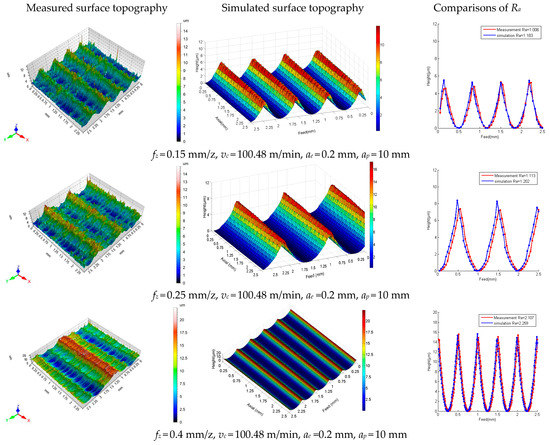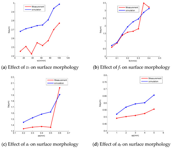 In order to further analyze the influence of different milling parameters on the surface topography, the surface topography under different conditions was measured and predicted. The two-dimensional surface roughness parameter value Ra and the three-dimensional surface roughness parameter value Sa were extracted from the measurement results and simulation results, respectively. The simulation results and the measured results are shown in Figure 13. It can be seen that the simulation results are in good agreement with the measured results in terms of the influence trend of milling parameters on surface roughness.