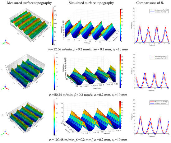 The comparison of surface topography at different milling speeds is shown in Figure 14. In terms of amplitude and trend, the simulation results are in good agreement with the experimental values. The simulated values of Ra have an average error of 9.98%. The milling speed has no obvious effect on the surface topography only considering the influence of geometric factors. However, milling speed is the main factor affecting milling stability. It can be seen from Figure 13a and Figure 14 that when the milling speed is small, the dynamic displacement of the milling system is small. When the milling speed vc is higher than 87.92 m/min, the dynamic displacement of the milling system increases sharply and the Sa deviation value of the milling surface becomes larger and larger.