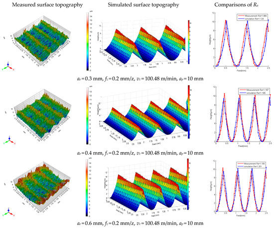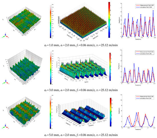 Axial milling depth directly determines the stability and dynamic displacement of the milling system and then has a direct impact on the surface topography. It can be seen from Figure 13d and Figure 17 that ap directly affects the dynamic displacement of the cutting tool in an ultra-high strength steel milling, thus causing the change in the roughness of the machining surface. However, when ap = 5 mm, the system is in an unstable state. Most of the self-excited vibration energy caused by the cutter teeth in the range of cutting the workpiece cannot rely on free vibration consumption after cutting the workpiece to the next cutter teeth before cutting the workpiece, which causes the dynamic displacement of the tool to diverge, resulting in a large range of vibration, so that the roughness of the machining surface increases sharply. The simulated values of Ra have an average error of 11.32%.