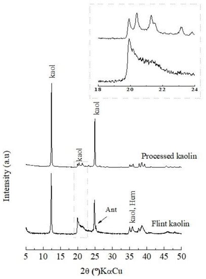 XRD flint kaolin and processed kaolin: kaol = kaolinite; Ant = anatase; Hem = hematite.