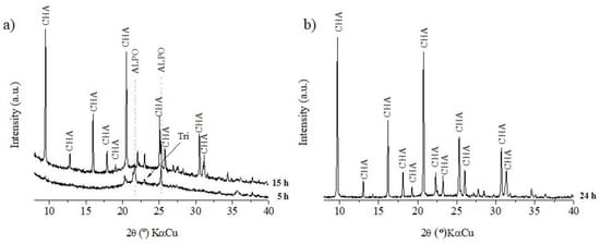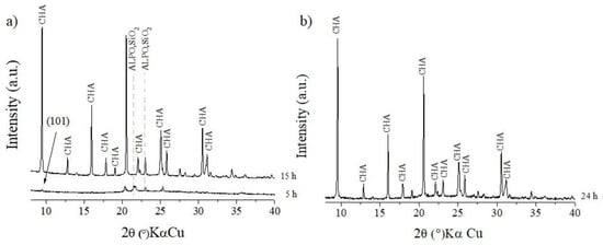 In contrast, for x = 1 and x = 2 (Figure 3 and Figure 4), the increase in the amount of morpholine significantly increased the formation of the CHA structure in a shorter amount of time, whereas the peaks of tridymite evidenced for x = 0.5 were absent at 15 h (x = 1 and x = 2). This observation is related to the positive effect of SDA on the SM2 and SM3 substitution mechanisms. Studies show that an increase in SDA in the synthesis promotes favorable conditions not only with the function of directing the structure, but also with importance in the distribution of silicon in the structure [29,30,31,32].