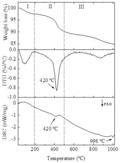 Figure 6 shows the TG, DTG, and DSC curves of the sample (x = 1 and 24 h of crystallization). Three thermal weight loss events stand out, which we identified as I, II, and III. The first weight loss (I) was related to the physical water desorption from the sample, which occurred in the temperature range from 25 °C to 200 °C and agreed with the endothermic peak present in the DSC curve. Thermal event II was the region of greatest weight loss, which occurred between 200 and 500 °C and was related to the decomposition of morpholine, which was used as an SDA. The intense and accentuated peak was related to this thermal transformation, which involved high energy, since there was a strong interaction between SDA and the SAPO-34 structure. The third weight loss (III), above 500 °C, was related to the volatilization of the waste from the combustion of morpholine in the SAPO-34 channels [28,34]. Because events II and III were related to the decomposition of morpholine by combustion, they released energy, which is evidenced in the DSC curve by the exothermic peaks. The exothermic peak at ~998 °C is related to the collapse of the molecular sieve structure, thus indicating good thermal stability.