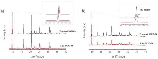 (a) Comparison of the products synthesized: XRD processed SAPO-34 (non-calcined) and flint SAPO-34 (non-calcined); (b) XRD processed SAPO-34 (calcined) and flint SAPO-34 (calcined).