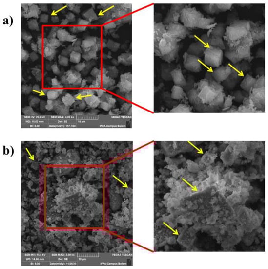 Figure 8 shows SEM micrographs for the calcined samples: S-PMK-Calcined (Figure 8a) and S-FMK-Calcined (Figure 8b). The samples have characteristic cubic morphologies for SAPO-34 (yellow arrows). However, for the sample synthesized with the flint kaolin, it can be observed that many scraps are agglomerated on the surface of the cubic crystals, showing a possible influence of the impurities present (Fe and Ti ions) in the flint kaolin.