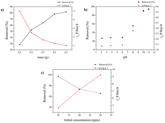 Figure 9c shows the effect of the initial concentration of dye, considering the pH to be 11 and the adsorbent mass to be 0.1 g. The behavior of the adsorption capacity was practically linear with increasing initial concentration, and this growth was expected because when the initial concentration increased, the concentration gradient increased, thus favoring higher adsorption; however, there was a decrease in the removal due to the availability of sites, which reduced the removal capacity [38,39,40].
