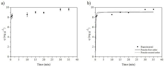 Figure 10a,b show the adsorption kinetics and the fitting of the experimental data to the kinetic models, respectively (pseudo-first-order and pseudo-second-order), considering an initial concentration of 10 mg·L−1, room temperature, adsorbent mass of 0.1 g, and pH 11.
