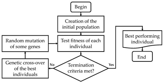This process takes place during a pre-set number of generations or while the mean performance of the newly created population is significantly better than the previous one. Once any termination criteria are met, the GA provides the best-performing solution. The entire process is represented graphically in Figure 1, which is designed on the basis of [20,21].