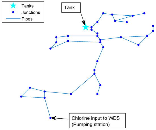 Considering the availability of sensors in practice is always a limitation, the idea is to estimate the chlorine concentration in the whole WDS (all nodes) at any time regardless of the reduced number of chlorine sensors. To do that, the proposed methodology considers a few chlorine measurements at some nodes. It is also considered that those measurements are obtained for a duration of at least two days, i.e., 48 h. The performance of the proposed methodology is tested using synthetic data generated via a simulation. To do that, initial conditions of the sourced chlorine at the pumping station and initial chlorine concentration at the nodes are assumed to be known, whereas the bulk and wall reaction coefficients are considered as unknown variables. Then, for every node, the chlorine concentration value at each sampling time is obtained by performing a simulation process through the well-known EPANET-MATLAB Toolkit [23].