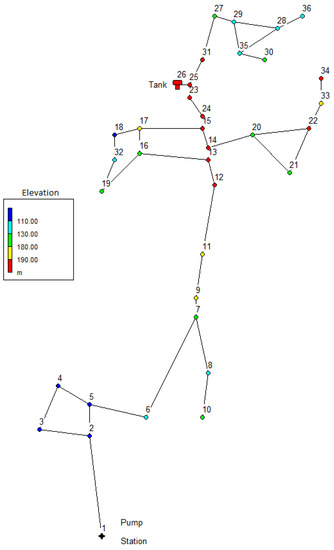 where is set as the optimization goal for the GA, that is, a proposed vector is found that contains the optimal values for and that minimize the value of . It is not expected that a single generation will provide the optimal values and thus the best-performing vectors are selected for the cross-over and mutation stages, which are repeated iteratively until a satisfying match is found. The methodology presented in this paper is programmed with the aid of the OpenWater Analytics EPANET-MATLAB Toolkit [23], which is an open-source software used for interfacing the EPANET tools in a MATLAB programming environment. As a pseudocode, this process is summarized as follows: