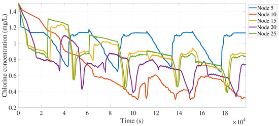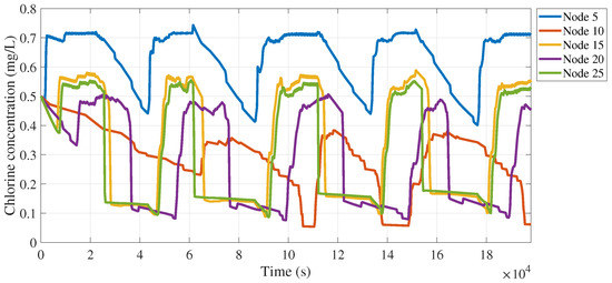 The system is made up of 1 pumping station (node ) that is also the input node for chlorine, 1 tank (node ), 34 connection nodes, and 40 pipe segments. It is assumed that only nodes , , , , and have chlorine concentration meters installed; thus the EPANET-simulated chlorine concentration values at said nodes will be used as the reference value for calibration, while in experimental applications of this methodology these values can be replaced by physical measurements without major changes. At the pumping station, the input chlorine concentration is 0.8 and also the initial chlorine concentration condition at the entire WDS is 0.5 . Note that the values corresponding to and are still unknown. Figure 5 shows the evolution of the chlorine concentration value as simulated by EPANET for nodes , , , , and for a period of 198,000 s = 55 h.
