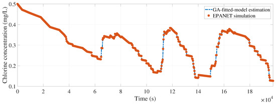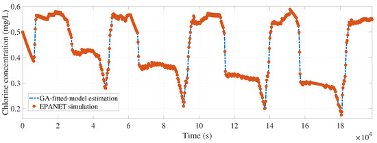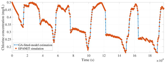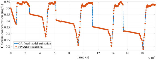 Figure 6, Figure 7, Figure 8, Figure 9 and Figure 10 show the comparison between the EPANET-simulated and the GA-fitted-model chlorine concentration values in nodes 5, 10, 15, 20, and 25 respectively.