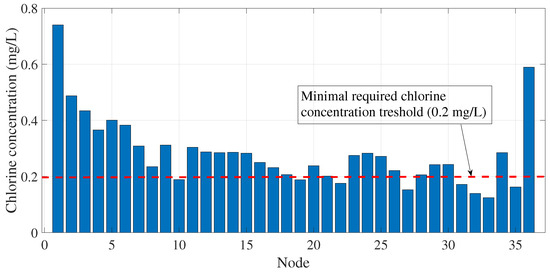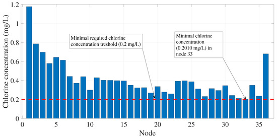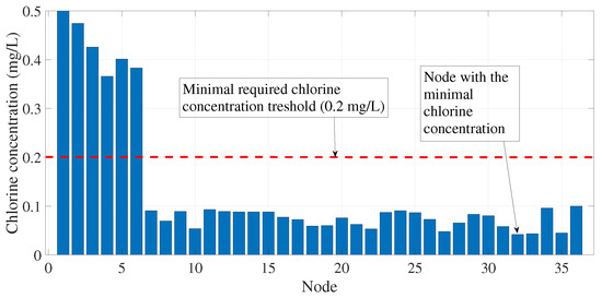 Application of the proposed methodology allowed for calibration of the required chlorine concentration at the input node to ensure that the minimal normativity-required value was met for every node in the network. The first calibration process to estimate the values of and coefficients was performed under an input chlorine concentration of and an initial chlorine concentration of . Actually, once the and parameters are calibrated, it is possible to perform a quality simulation at the uppermost condition for the initial chlorine concentration ( ), which yields that the minimal chlorine concentration threshold is not met, since many nodes are still under the required 0.2 concentration, as shown in Figure 14.