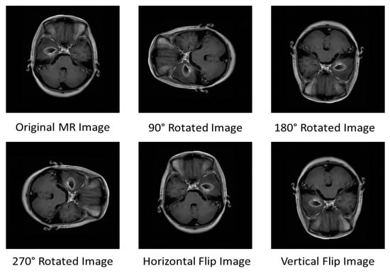 We use a publicly available brain MRI dataset called Figshare developed by Cheng et al. []. The dataset contains 3064 T1-weighted brain MRI slices of three different categories of tumor for example meningioma, glioma, and pituitary obtained from 233 patients. The dataset comprises 708 meningioma slices, 1426 glioma slices, and 930 pituitary slices. All images are stored in .mat format. The MRI slices are normalized with an intensity range between 0 to 1. Figure 2 shows three categories of brain tumors from the Figshare dataset. Figure 3 demonstrates the images obtained after the application of the data augmentation technique.