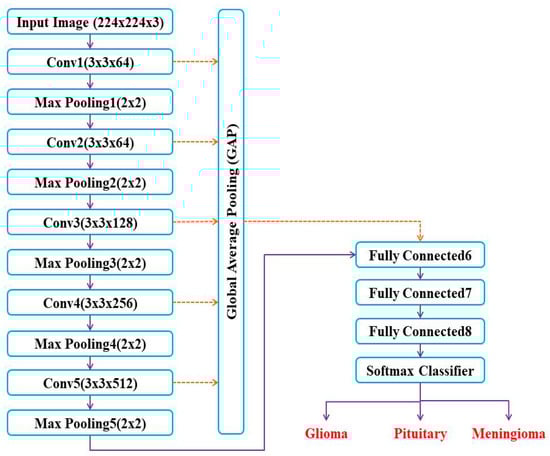 Therefore, we use a pre-trained DCNN architecture called as VGGNet based on transfer learning to classify brain tumors for instance meningioma tumor, glioma tumor, and pituitary tumor. Usually, the pre-trained architecture is previously trained on a large dataset and used to transfer its learning parameters to the target dataset. Therefore, the pre-trained model can consume less time since it does not require a large dataset to get the results. The top layers of the VGGNet model extract the low-level features for example colors and edges whereas, the bottom layers extract the high-level features for example objects and contours. The objective is to transfer the knowledge learned by VGGNet to a different target task of classifying brain tumor MRI images. The main objective of using VGGNet over other pre-trained networks is the use of small receptive fields in VGGNet rather than massive fields. Due to the use of smaller convolutional filters in the VGGNet, it contains a significant number of weight layers and in turn, it provides better performance. Further, this proposed approach uses a Global Average Pooling (GAP) layer at the output to avoid overfitting issues and vanishing gradient problems. The GAP layer is used to transform the multidimensional feature map into a one-dimensional feature vector [,,]. Since the GAP layer does not need parameter optimization, therefore, the overfitting issue can be escaped at this layer. The major contributions of the proposed research work are listed as follows