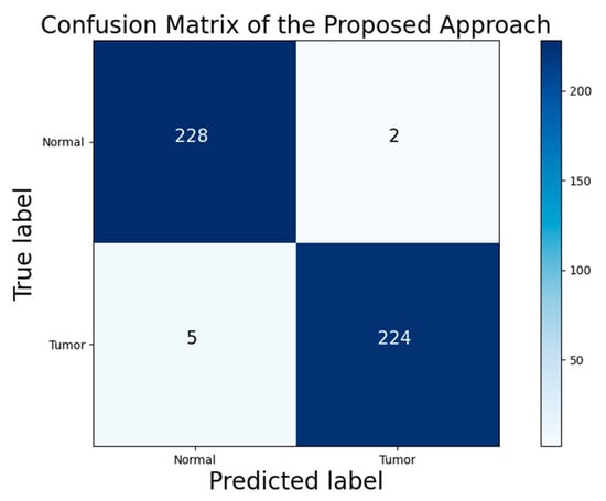 Brain tumors arise due to the unusual growths and unrestrained cell division in the brain. It can deteriorate the health condition of a patient and expedite casualty if not detected precisely []. Generally, brain tumor is grouped into two varieties, for example malignant tumor and benign tumor. A malignant tumor is regarded a cancerous tumor and a benign tumor is considered a noncancerous tumor. The objective of tumor detection is to identify the position and extension of the tumor area. This detection task can be accomplished by comparing the abnormal areas with the normal tissue []. Accurate imaging analysis of brain tumor images can determine a patient’s condition. MRI is an extensively used imaging technique for the study of brain tumors. The brain MR images provide a clear representation of the brain structure and abnormalities []. It is observed that for brain tumor detection, two important imaging modalities such as CT scan and MRI are used. However, as compared to CT scans, MRI is preferred due to its non-invasive nature which produces high-resolution images of brain tumors. Usually, brain MRI can be modeled into four modes such as T1-weighted, T1-weighted contrast-enhanced, T2-weighted, and T2-weighted FLAIR. Each model illustrates different features of a brain tumor []. In the literature, various automated approaches have been introduced for brain tumor classification utilizing brain MRI. Over the years, support vector machine (SVM) and neural network (NN) based approaches are extensively utilized for brain tumor classification [,,,]. Konur et al. [] proposed SVM based approach where the SVM model is first trained with known samples and then, the trained model is used to process other brain tumor images. Xiao et al. [] developed a segmentation technique by merging both Fuzzy C-Means and SVM algorithms.