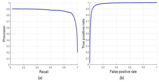 (a) Receiver operator characteristics (ROC) curve (b) Precision-recall (PR) curve of the proposed approach.