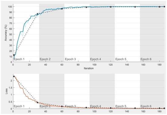 Usually, feature maps assist in determining the active areas of brain MR images which play a significant role in the tumor classification procedure. The outer layers of the network emphasize granular features such as the shape of the brain and locations of tumors. The granularity of the features minimizes as we proceed through the layers. The last layer produces fine granular features which can find small tumors. At last, the generated feature maps are employed to classify the brain MRI using a Sigmoid activation function. The receiver operator characteristics (ROC) curve and precision-recall (PR) curve of the proposed classification methodology is shown in Figure 7. The training progress of the proposed transfer learning-based framework is presented in Figure 8. It shows the variation of accuracy percentage versus the number of epochs. It is perceived that with increase in epochs, the model attains the minimum mean square error and converges. Finally, our proposed transfer learning-based DCNN model attains an accuracy of 98.9% on the Figshare dataset.
