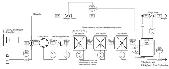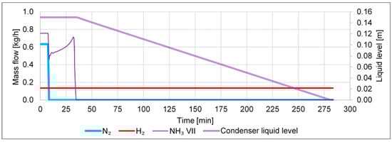 The 10 L condenser in Figure 1 separates the reactor products into mainly liquid NH3 in stream VII and gaseous H2, N2, and NH3 in stream VIII. The condenser liquid level is controlled (LC) via outlet stream VII. Stream VII is stored in a 30 L pressurized tank at 20 bar at ambient temperature in the liquid state. The pressurized tank is not included in Figure 1.