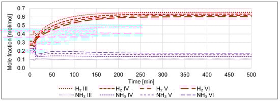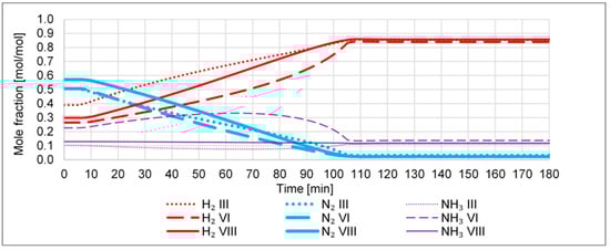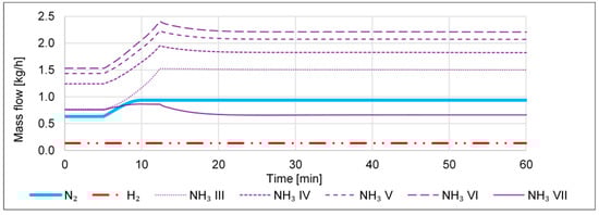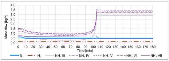 However, the failures in the N2 and H2 supply, scenarios (c) and (d), should be remedied as quickly as possible should they occur. In the long run, these are the only scenarios that lead to a zero NH3 output of the cycle. The system will continue to operate, but the inlets will be purged after some cycles in the loop, with no NH3 being produced. As a consequence of the real plant tests, a temporary failure in the N2 and H2 supply can be controlled, but, as was to be expected, a long-time failure needs to be fixed, and the plant needs to be shut down in the meantime.