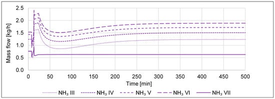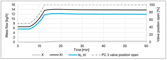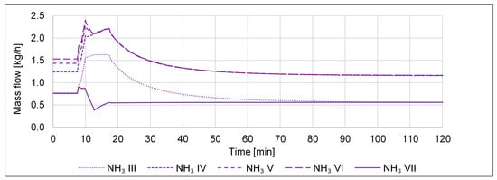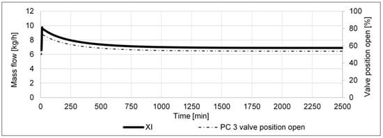 The results of scenario (h) are depicted in Figure 20, Figure 21 and Figure 22. In Figure 20, the constant condenser liquid level (left vertical axis), as well as the condenser temperature decrease (right vertical axis), are displayed. The constant liquid level value, similar to scenario (g), also shows that the LC works despite a change in the condenser temperature. As can be seen in Figure 21, the material in the cycle (s. stream XI) first decreases rapidly and then slowly increases to a value of 6.4 kg/h, 0.2 kg/h less than at the start of the scenario. This means that in contrast to scenario (g), the mass in the system decreases, and this comes along with an increase in liquid NH3 output and a reduction in the mass that is lost in the purge (s. Figure 22 left and right vertical axis, streams NH3 VII and X).