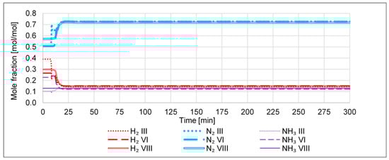 The results of scenario (i) are depicted in Figure 23, Figure 24, Figure 25 and Figure 26. In Figure 23, the change from a falling temperature profile of 380, 380, 350, and 340 °C in the preheater and the three reactor compartments to an isothermal profile of 400 °C is depicted (s. streams III to VI). Consequently, the mole composition profile in the reactor changes as well, as can be seen in Figure 24. The conversion into NH3 decreases in the first reactor compartment (s. the drop of the mole fraction NH3 IV in Figure 24). In the two following compartments, no NH3 is produced anymore, as the mole fractions NH3 V and VI are the same as the mole fraction NH3 IV. Furthermore, the NH3 composition at the outlet of the third reactor section, stream VI, is significantly lower than at the start of the scenario. This means that less NH3 can be condensed in the condenser, and the liquid NH3 stream VII leaving the cycle decreases, as depicted in Figure 25.
