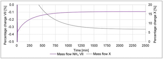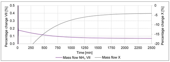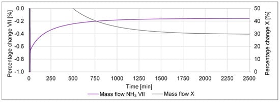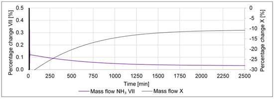 Percentage change of mass flows NH3 VII and X (left and right vertical axis) of scenario (f).