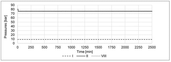 The dynamic behavior of the cycle is simulated in Aspen Plus Dynamics®. The main simulation parameters are listed in Table 2. HYSPR with modified parameters supplied by a project partner [] is used as the property method (s. Table 2). For simplicity, a black-box model with a linear 0–15 kWel input, i.e., 0–100% capacity, and 0–3 Nm3 H2/h output with changes of 1 kWel/min, is used for the electrolyzer. The controls are of type PID and tuned successively using the Ziegler–Nichols method. The default settings of the solvers are used, i.e., Mixed Newton for the non-linear solver in each time step and Implicit Euler to reach the next time step.