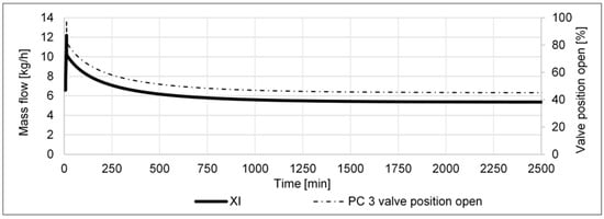 Further mass flows (left vertical axis) and position of the recycle valve (right vertical axis) of scenario (c).