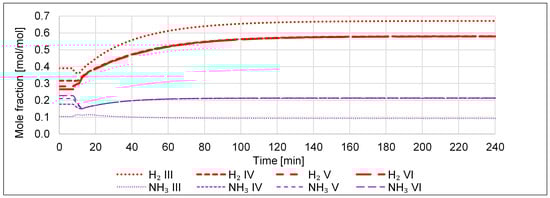 In addition, a lower NH3 conversion in the reactor means that more N2 and H2 remain in the system, leading to a higher recycle mass flow (s. sharp increase in stream XI in Figure 26) and an increase in the opening of the recycle valve (s. the rapid opening of the recycle valve position in Figure 26 right axis). As a last resort to prevent a potential pressure increase in the high-pressure section of the cycle, the purge valve opens, and the purge stream X in Figure 26 increases. At ca. minute 17 (s. Figure 25 and Figure 26), the system starts to stabilize. More and more N2 and H2 enter the system through the inlets. However, since almost three parts of H2 to one part of N2 enter the system, and both are not converted to as much NH3 as before, and H2 becomes the dominant component in the cycle with a molar share of almost 0.7 (s. Figure 24 molar fractions of H2 of streams III to VI). This change in composition leads to a new and stable steady state as NH3 conversion starts to pick up again (s. rise in NH3 mole fractions IV to VI in Figure 24). This conversion decreases the recycle mass stream (s. stream XI in Figure 26), and the recycle valve is closed again (s. also Figure 26 right axis). All streams in Figure 24, Figure 25 and Figure 26 level off, and at approximately minute 240, the new steady state is reached.