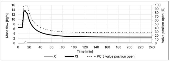 Selected mass flows (left vertical axis) and condenser liquid level (right vertical axis) of scenario (c).