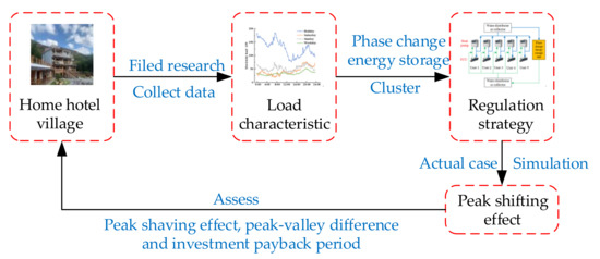The structure of this paper is as follows: the second part provides the characteristics of the energy consumption behavior of the home hotel village, which was obtained via on-site research. The third part gives the analysis results of the load characteristics of the home hotel buildings with the electricity consumption data of the home hotel village. The fourth part introduces the proposed cluster control strategy, including the phase change energy storage system and control logic. The last part describes the use of a home hotel cluster of the village as an example to simulate and analyze the peak-load-shifting effect of the cluster control strategy. The flow chart of the detailed methodology is shown in Figure 1.