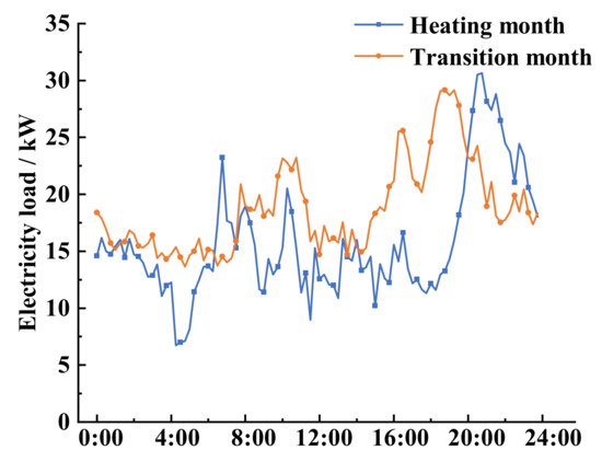 Furthermore, it can be considered that there were few visitors on the day with the lowest electricity load of each month, and the electricity consumption was mainly caused by the villagers, which was called “No Visitors Day”. Comparing the lowest daily loads of the heating and transition months, an interesting phenomenon was found. Both of the load curves remained at a low level, below 30 kW all day, and the general trends were similar (Figure 6). Therefore, it can be inferred that the air conditioning electricity consumption caused by villagers was negligible. Thus, it can be considered that on “No Visitors Days” the load only included the daily-life load of villages.