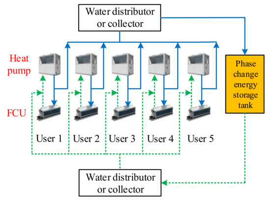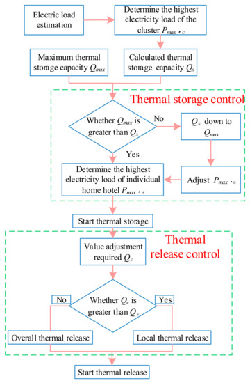 According to the above analysis, the number of visitors, i.e., the day type, was the key factor that affected the electricity load of the home hotel village. The scale of one home hotel was small, and thus, a cluster energy storage and peak-shifting strategy was proposed based on the load characteristics analysis. Several rural home hotels were combined into a cluster, and an energy storage tank was arranged in the cluster. Each user can absorb energy from and release energy into the energy storage tank. The control strategy was uniformly scheduled by the users’ real-time electricity load.