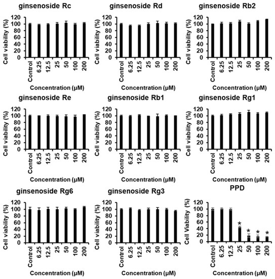 Cytotoxicity of ginsenosides and PPD on HUVECs. The HUVECs were treated with ginsenosides or PPD at various concentrations (6.25–200 μM) or with 0.5% dimethyl sulfoxide only (control) for 24 h, followed by the evaluation of cell viability by the EZ-Cytox assay. Data are presented as the mean ± standard deviation (SD) of three independent experiments. * p < 0.05 compared to the control group.